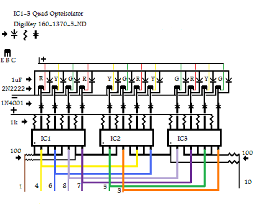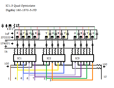 The picture on the left shows the color output of the lights. I used phone wire to connect to the lights. The lights are left to right as you look at it.(SW257-258, SW259-260,SW261-262,SW263-264) In the upper left are the power in wires. The black wire is negative and the red wire is positive. On the right it shows the connection to the SE8c. Note the position of the brown wire. It keys the direction left to right. Reverse one or the other and it will reverse outputs of the lights. |