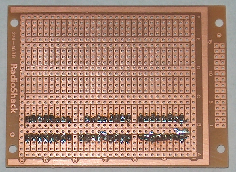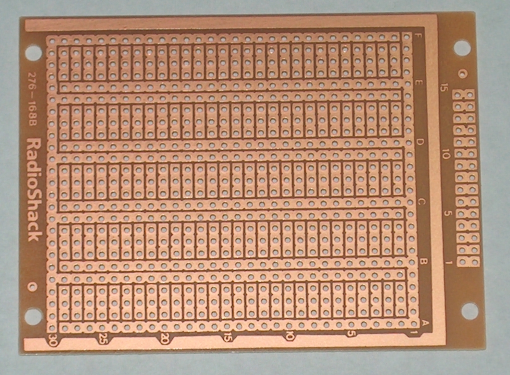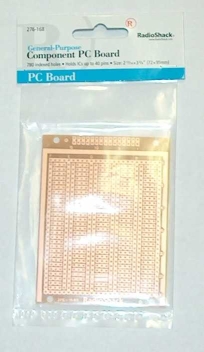 The board to the left is a Radio Shack board that is readily available at this writing.(still available at www.radioshack.com as of October 2010) It is Radio Shack part number 276-168. This is the board that I used to build this project on. I looked into a ready made board but unless I am willing to buy a couple thousand it is cost prohibitive. This project is really quite straight forward so I do not believe it is worth it.