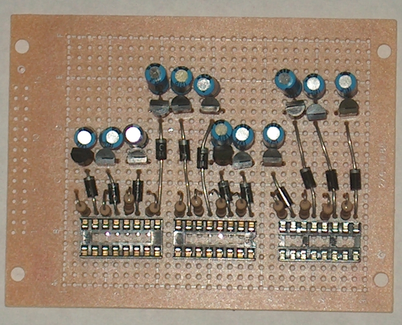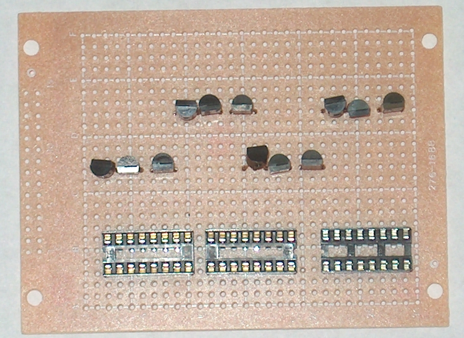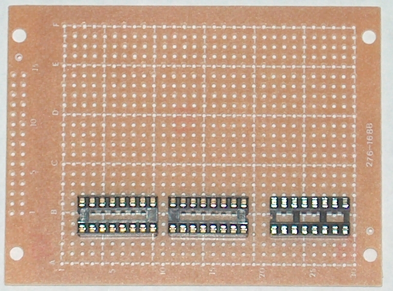 I start with the IC sockets in the picture on the left you can see how I lay them out on the board. These are 16 pin DIP sockets from Digikey. There will be a parts list at the end of this article. To the right is a backside view. |