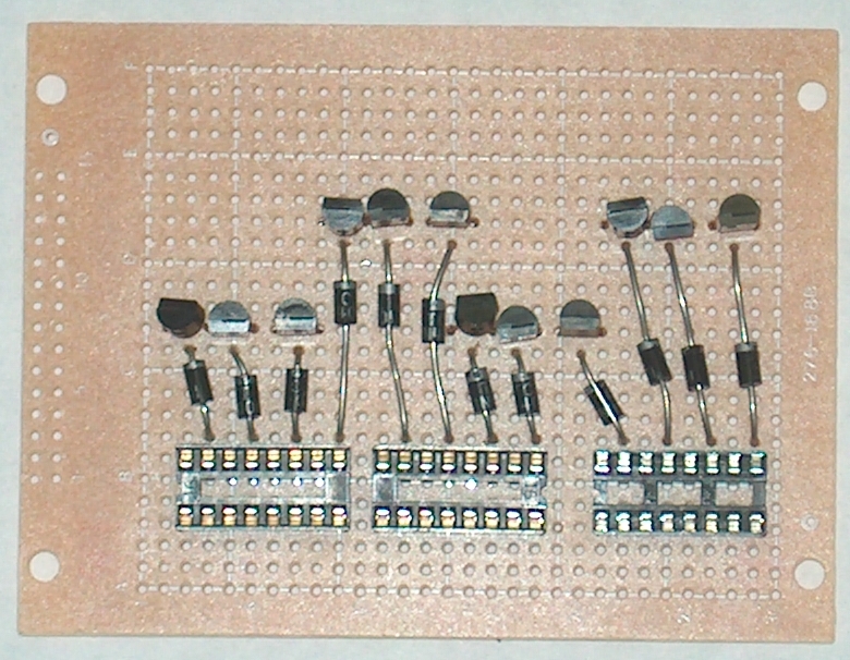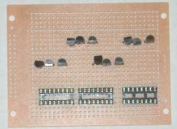 Here is the layout of the transistors. Notice how the emitters of a couple of them share a soldier spot. This makes it easier put the diodes in later. |