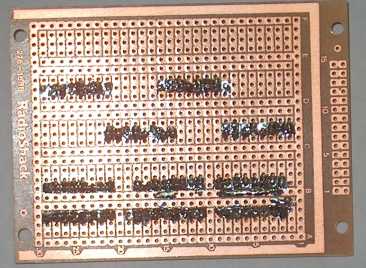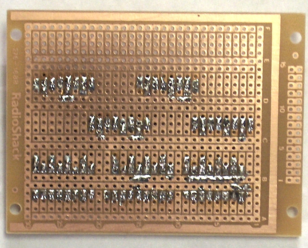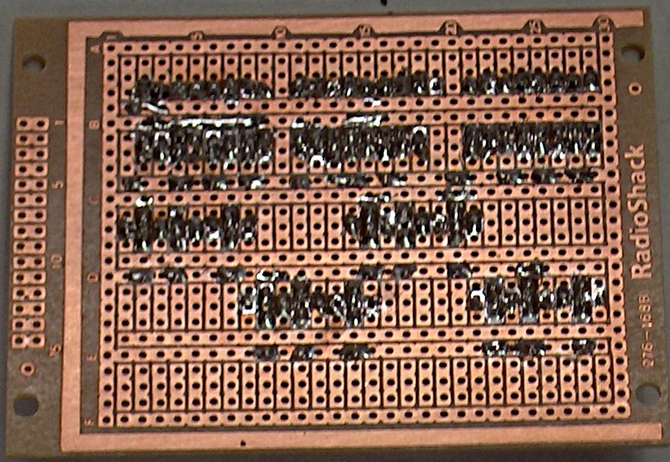 To the right is the copper side of the board as you can see it is a very vesatile board. We will be taking advantage of almost all the busses. Now lets start the project. I like to clean the board with clean Scotch brite. You never know how long the board has been on the Radio Shack shelf. I know that in the old days we used steel wool, I don't like to use steel wool. I believe that it leaves a steel residual on the board. I don't use any kind of liquid on the board. |