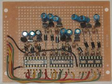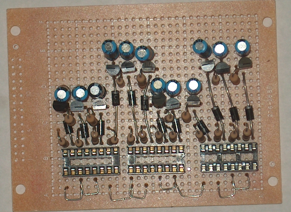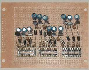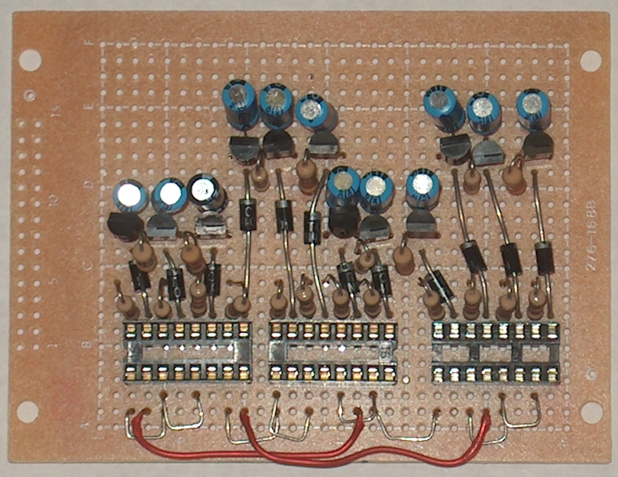 Next I install the 1K resistors and capacitors. The resistor goes to the upper even side of the 16 pin sockects and the other side goes to the positive buss. The positive side of the capacitor goes to the base of the transistors the negative goes to the negative buss. |